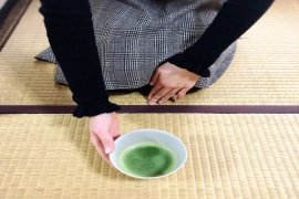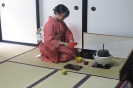 毎週火曜日と月1~2回土曜日にめぐみ荘で薄茶・濃茶などのお点前を習得するべく、お稽古に励んでいます。現在部員は4 年生4 名、3 年生2 名、2 年生1 名、1 年生2 名の計9 名です。