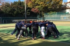 学内のテニスコートで週に2 回、授業後に活動を行っています。カトリック女子大学総合スポーツ競技大会での活躍を目標とし、コーチのご指導のもと、楽しくかつ真剣に練習に取り組んでいます。