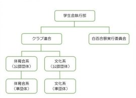 学生会の執行機関である執行部のもとに、クラブ連合と白百合祭実行委員会があります。
