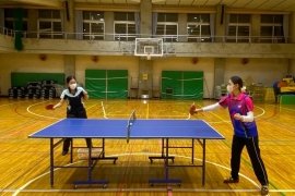 週1 ~ 2 回、現在5 名の部員が学内体育館で活動しています。ラケットの持ち方など初歩的なことからスタートし、応用的な卓球技術を身につけることを目標にしています。