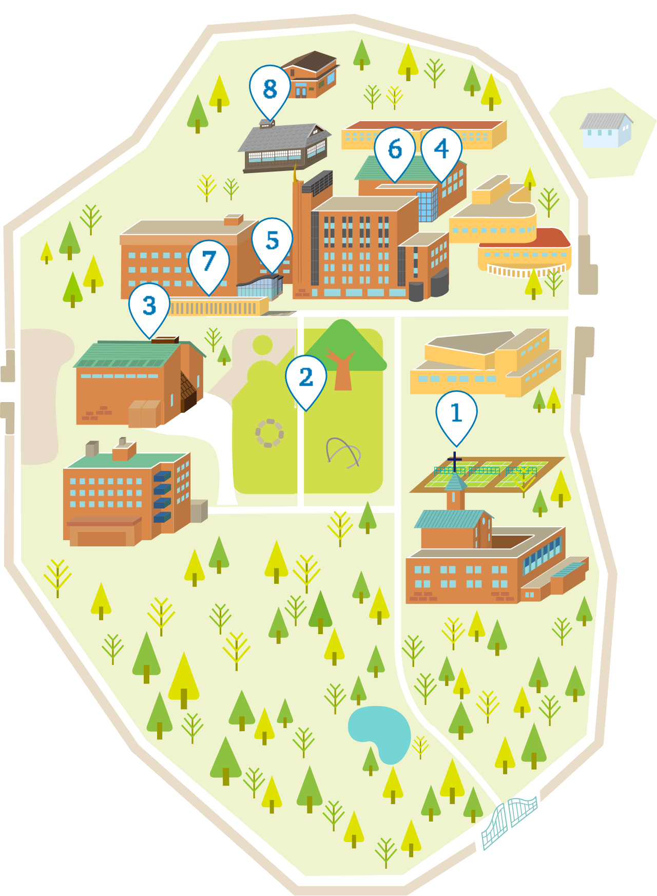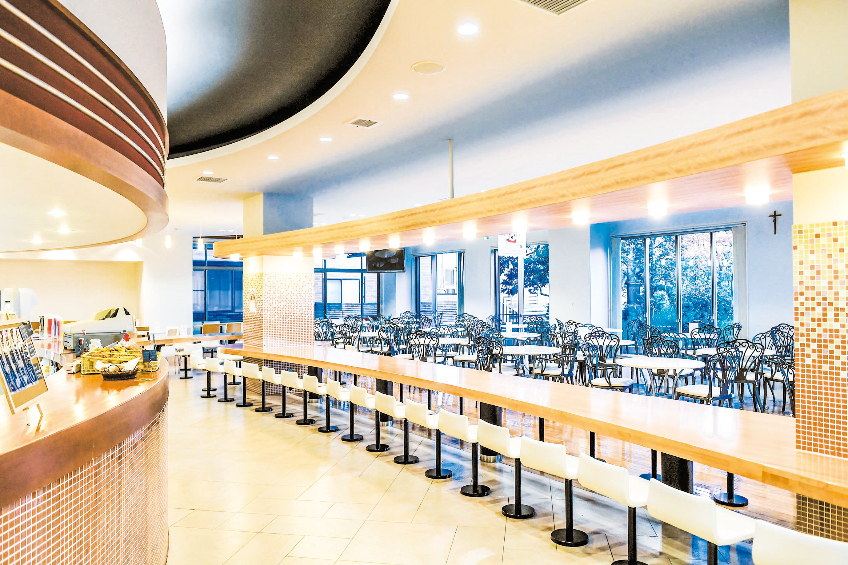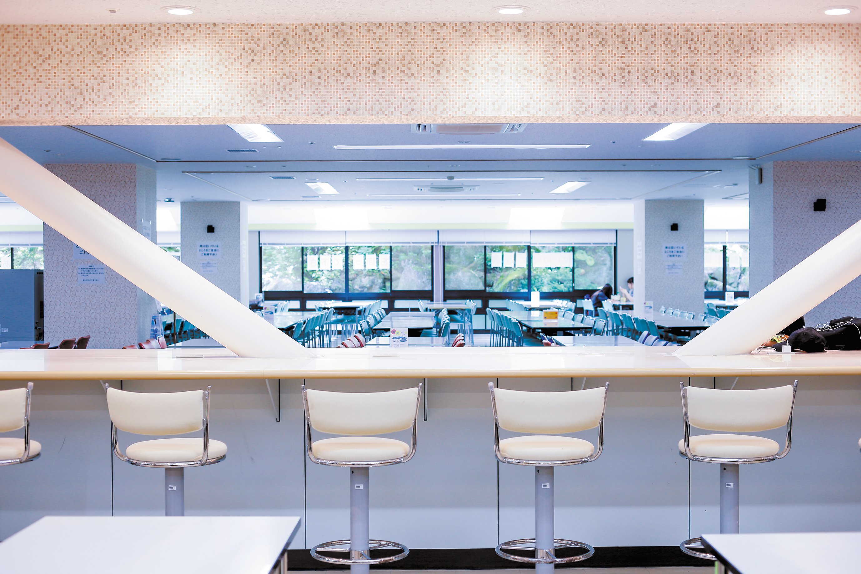 日替わりメニューを提供する11号館「カフェテリア」は、めぐみ荘を眺めるくつろぎの空間。人気のお弁当やパスタのほか、焼きたてパンや豊富なドリンクがそろっています。