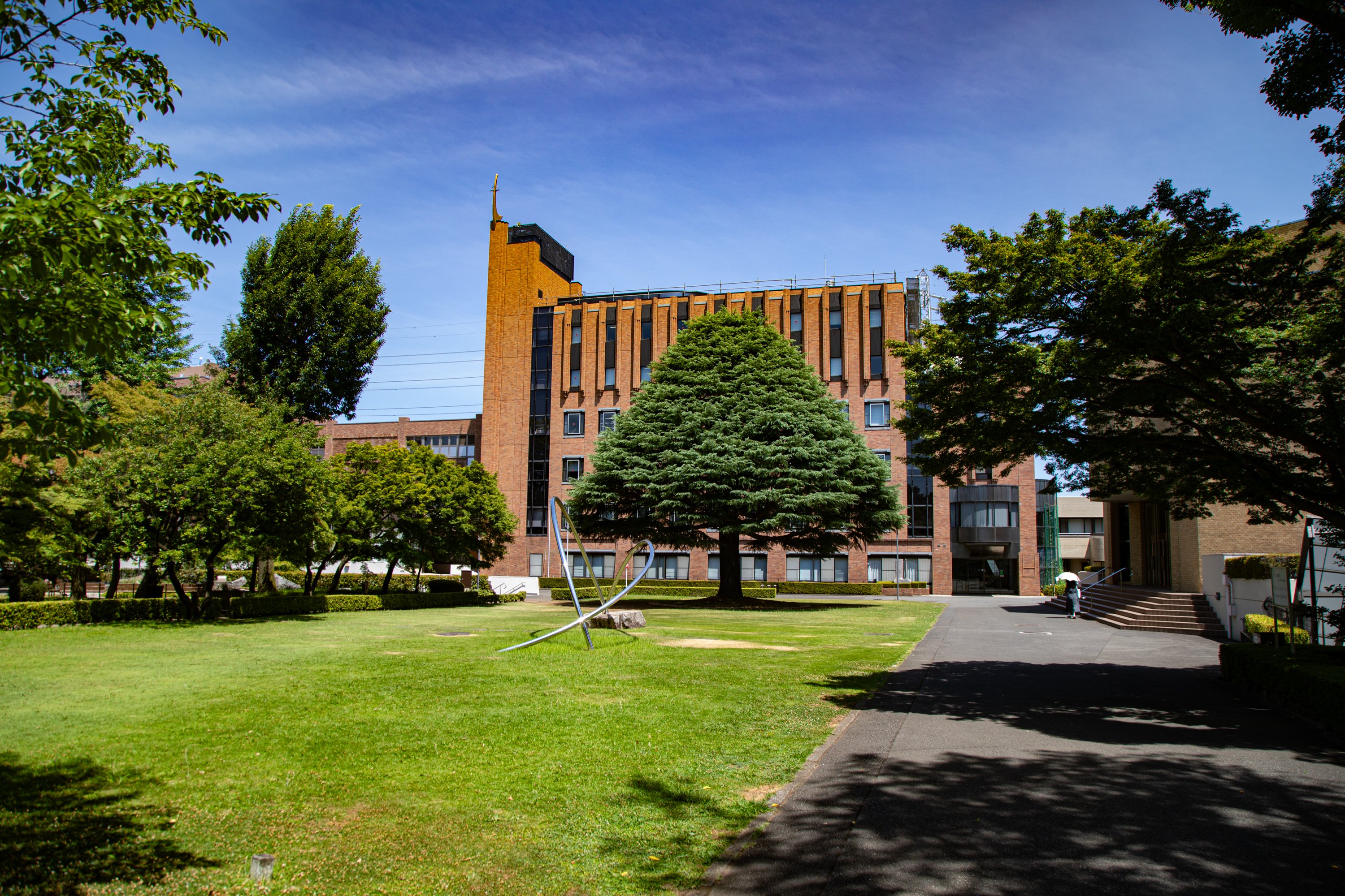 本館前の中庭にそびえるヒマラヤ杉は、キャンパスのシンボル。お天気のいい日のランチに、友人とのおしゃべりや読書に……多くの学生が集まる、癒しのスポットです。