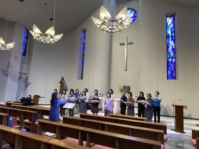 本学の聖歌隊。声楽の先生をお招きし、お昼休みに練習しています。「心を込めて歌い、歌の意味・心を伝える」ことを大切にしています。