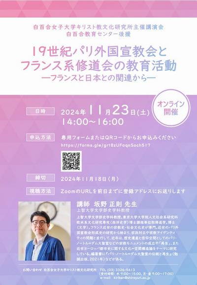 本学創立60周年を控え、日本における白百合学園の誕生にかかわる19世紀フランスの歴史・宗教・社会的背景等について、グローバルな視点からご講演いただきます。