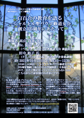 本学キリスト教文化研究所は、キリスト教と思想・文化・芸術・教育などとの関連について研究し、その成果を学内外に発信するために、多彩な活動を行っています。 このたび、本学の設立母体であるシャルトル聖パウロ修道女会創立325周年にあたり、2021年度オンライン講演会を以下のとおり開催することといたしました。 皆様のご聴講をお待ちしております。