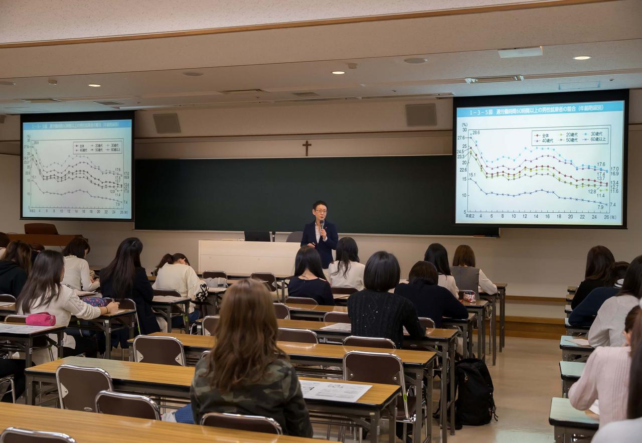 自分の未来を見据えて社会で活躍するための準備を1年次から始めます。「インターンシップ」や、「女性と起業」などの科目を通じ、社会人としての必要な素養を養うとともに実践的なスキルを身につけるのが狙いです。