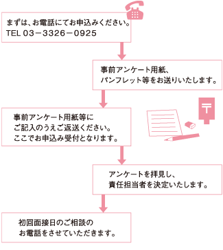 初回相談およびその他は全て予約制になっておりますので、お電話でお申込みください。