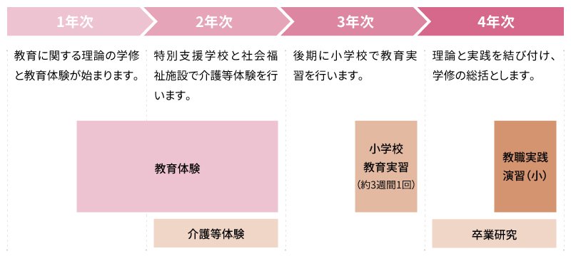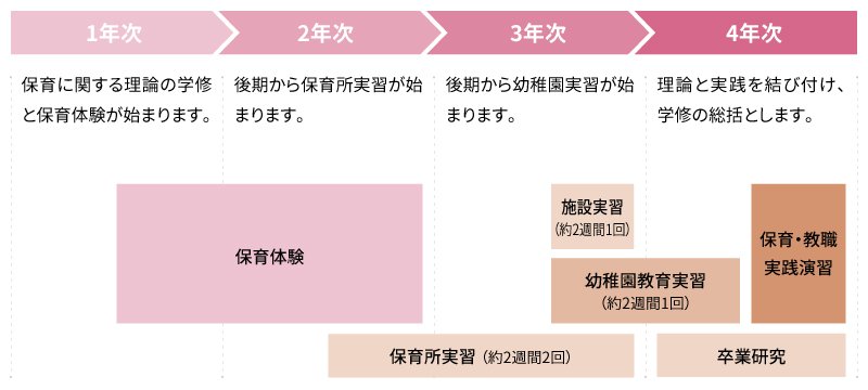 大学と現場を往復し、成長を目指します。早期からの実地体験により、円滑に保育・教育実習に進むことができます。