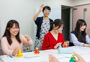 子ども理解の深化に役立つ児童文化学科・発達心理学科の授業を「隣接領域科目」として履修可能。子どもの心身共に健やかな成長を促す保育・教育の在り方を多面的に学んでいきます。