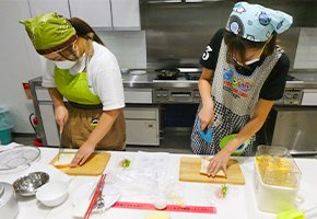 この授業では、食生活の意義や栄養の基本的知識を学び、子どもの発育・発達と食生活の関連について理解を深めます。多目的演習室で、離乳食作りも行います。