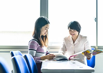 乳幼児期の教育・ケアの知識や技術を習得し、幼稚園教諭・保育士を目指す「幼児教育」、小学校での教育活動を創る力を養い、小学校教諭を目指す「児童教育」の2コースで専門性を養成します。