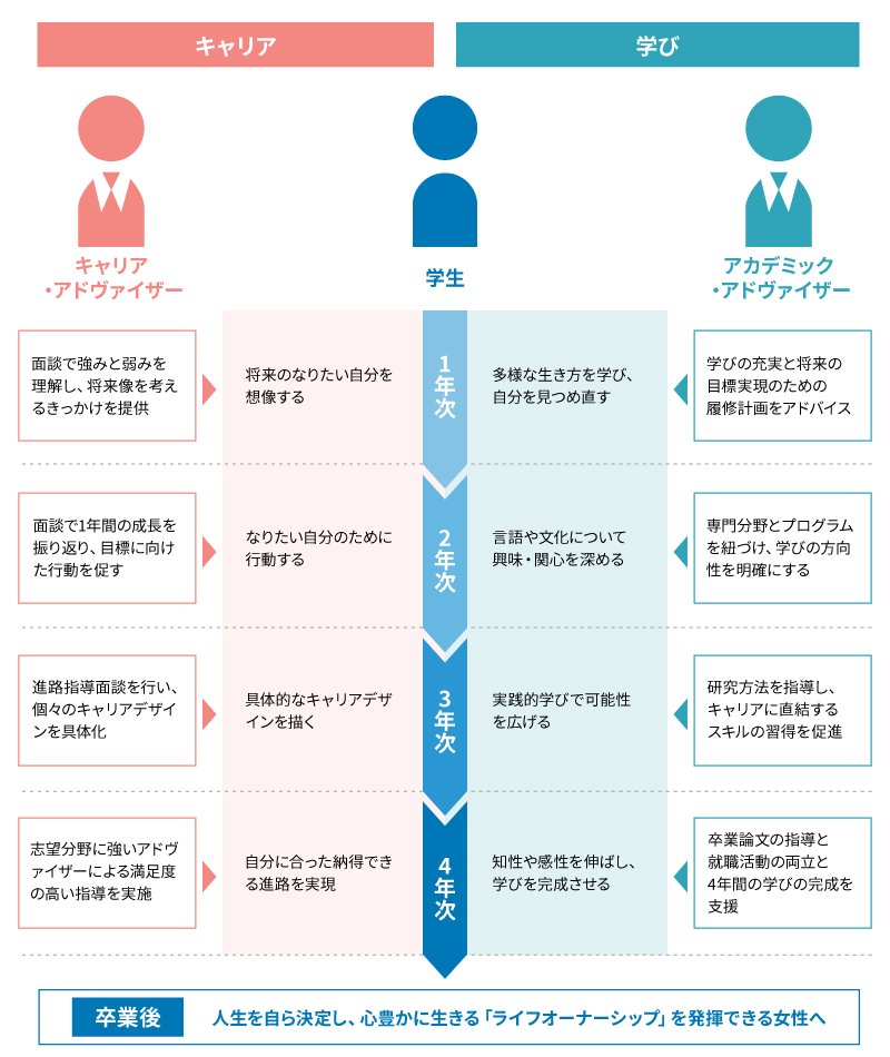 文学部では、「アカデミック・アドヴァイザー」と「キャリア・アドヴァイザー」の2名のアドヴァイザーが、1年次から学生をサポート。学生一人ひとりに合った的確なサポートにより、プログラム履修をサポートするだけではなく、人生を自分の力で切り開くことのできる自立した女性へ成長することを後押しします。