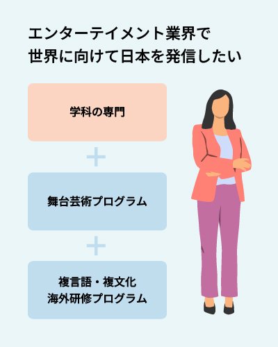 日本・フランス・英米の舞台芸術・演劇の歴史と広がりを学ぶことで、舞台芸術に対する深い知識と国際的な視野を身につけます。同時に、現場で活躍する演出家から舞台制作の過程を学び、実践的な経験とアカデミックな知識が融合したキャリアにもつながる力を養成するプログラムです。