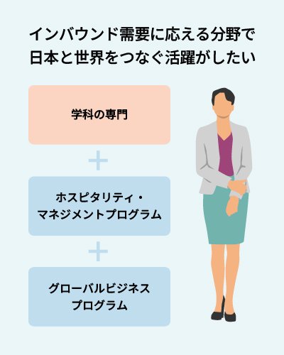 理論と実践の両面からホスピタリティを学び、第一線で活躍する女性を目指します。産官学連携プロジェクトや国内外のインターンシップなど、経験を積める多様なカリキュラムを通して<ホスピタリティのチカラ>を育みます。