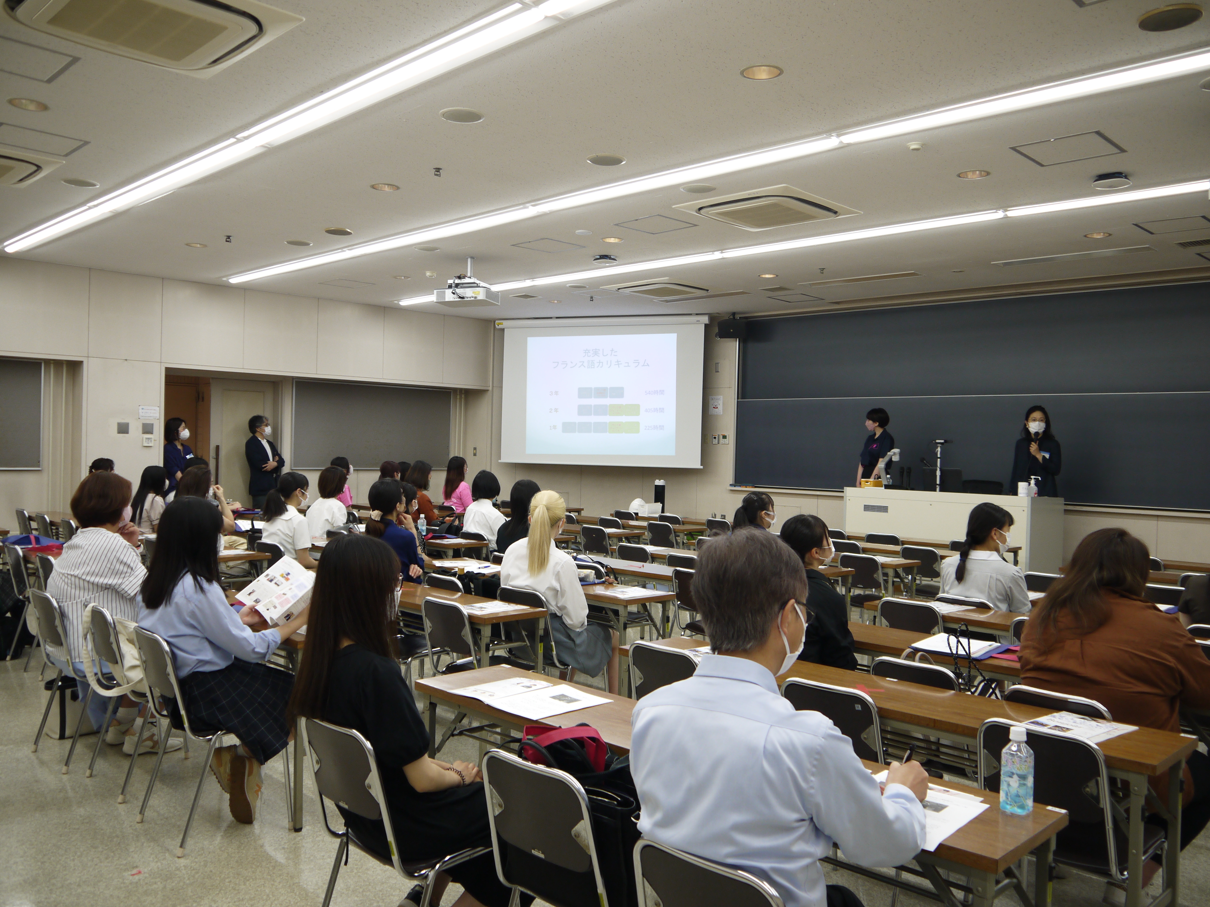 まずは教員による学科紹介。徹底した少人数教育によるフランス語のカリキュラムのほか、本学科最大の特長である、意欲のある学生がどんどん力を伸ばせ、授業についていくのに少し苦労する学生も安心してフォローアップが受けられる、「個別化フランス語学習プログラム」の説明がありました。4つの選択肢から自分の興味のあるプログラムを履修し、「専門ゼミ」で発表やディスカッションを通じた主体的な研究を実践する、3,4年次の学びの全体像もご理解いただけたと思います。