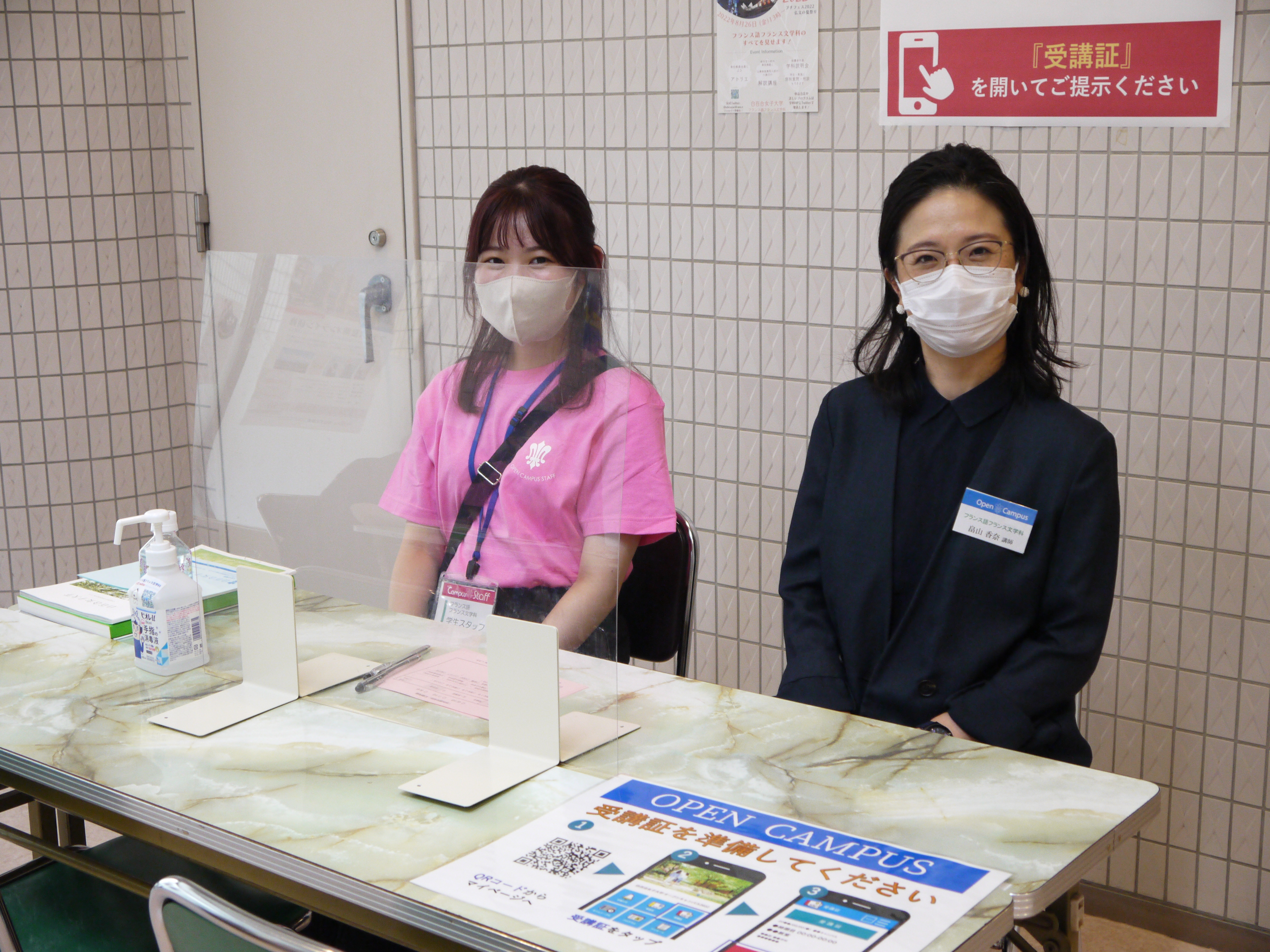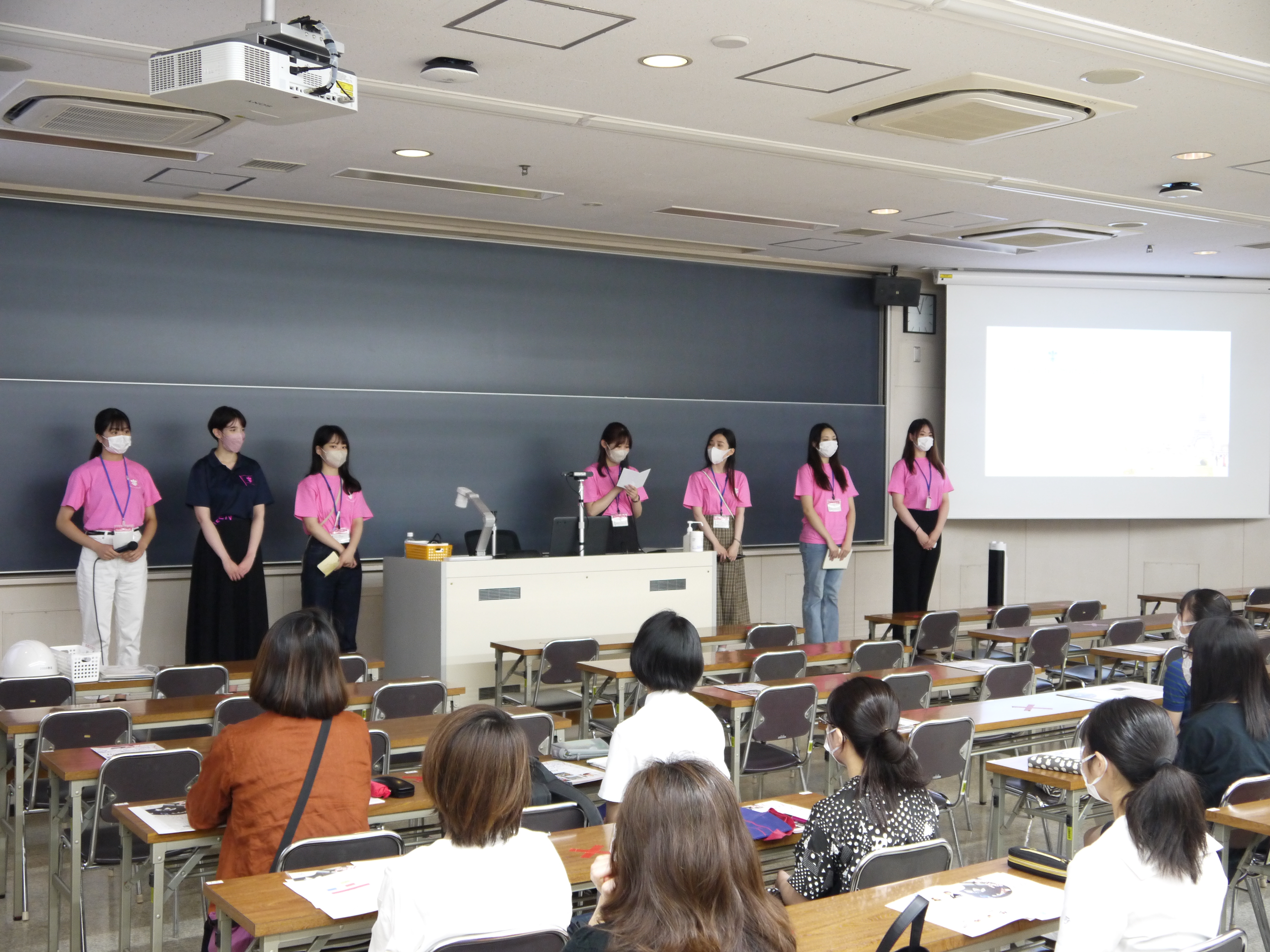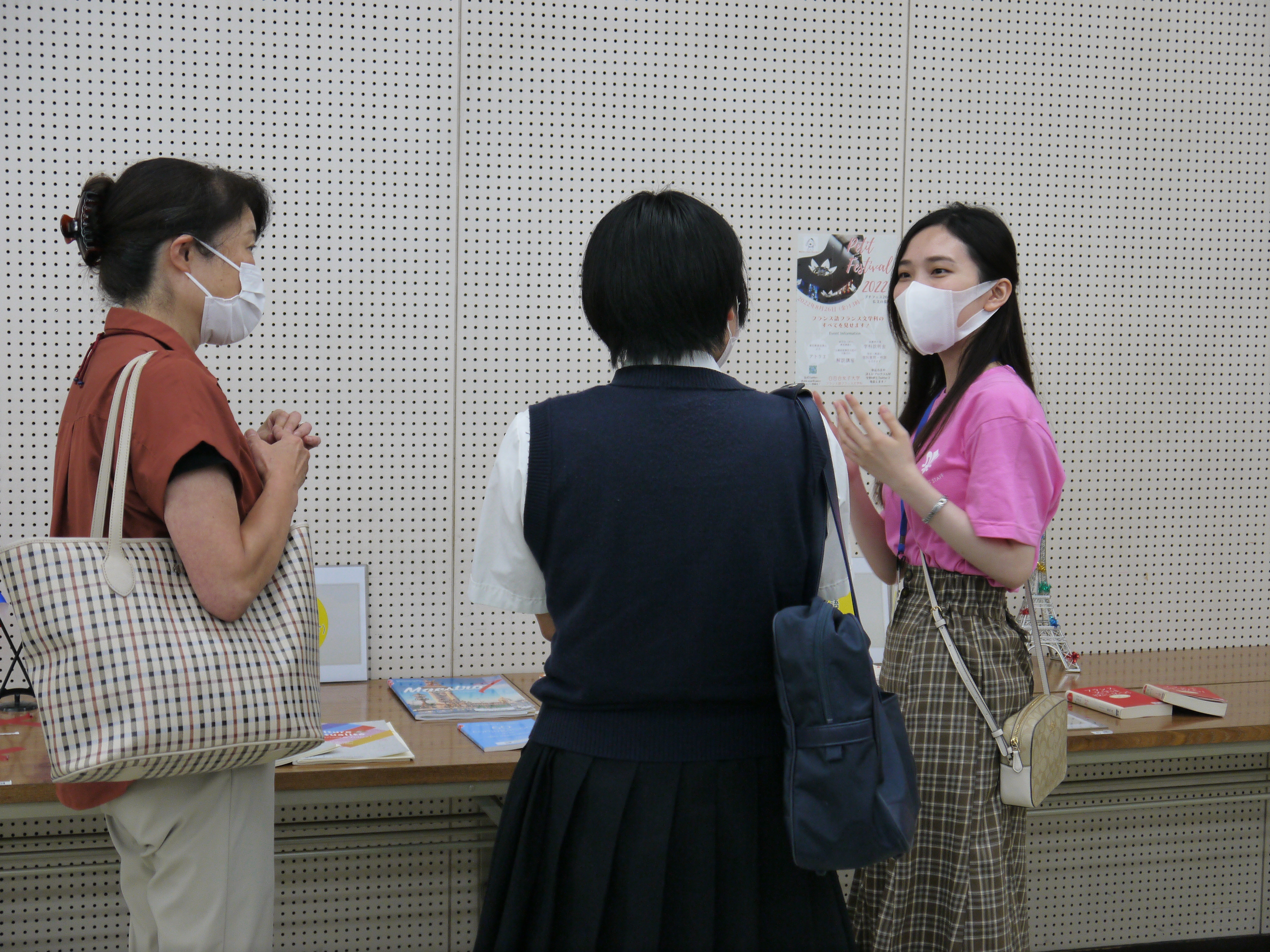 次は6名の学生スタッフとフランス人TAによるプレゼンテーションです。1回目、2回目のオープンキャンパスでも行われましたが、顔ぶれが変われば中身も変わります。今回は、実際に受けた白百合のフランス語の授業はどうだったか、ゼミでどんなことをどのように勉強しているかなど、現役の学生ならではの学びの体験に加え、アルバイトはしているのか、学業とどう両立しているのかといった、リアルな学生生活の話題もあり、高校生や保護者の皆さんが興味深そうに耳を傾けていました。学科の雰囲気や様子を知るには、在学生の姿を見て、生の言葉を聴いていただくのが、やはり一番なのですね。