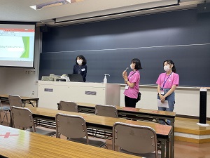 次に、現役学生による授業の紹介、学内での活動、ボランティアやアルバイトなどの学生生活の送り方について話があり、「大学生はどんな生活をしているのか」など、高校生の方からも質問をいただき、白百合女子大学で大学生活を送る学生のリアルな声を聴いていただきました。