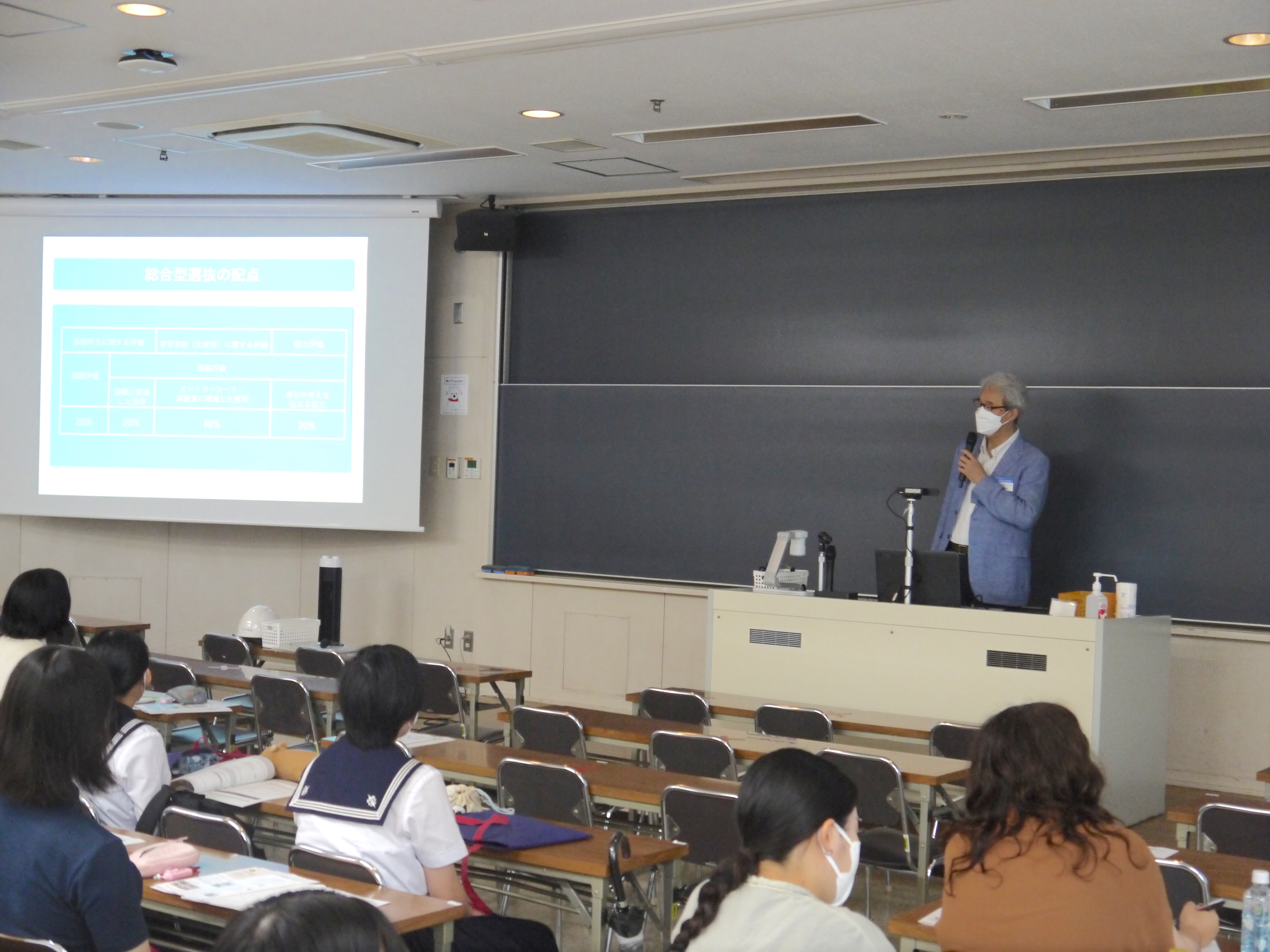 学科紹介の最後には学科長の善本先生から入試説明があり、総合型選抜、公募制学校推薦型選抜などについて、事前課題や面接のポイントについてのアドバイスをいただきました。