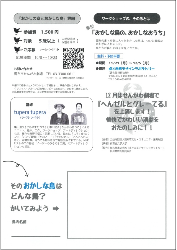 絵本作家・アートディレクターのtupera tupera、白百合女子大学の学生と一緒に、かぶりもの「 おかしな鳥」の工作をします。