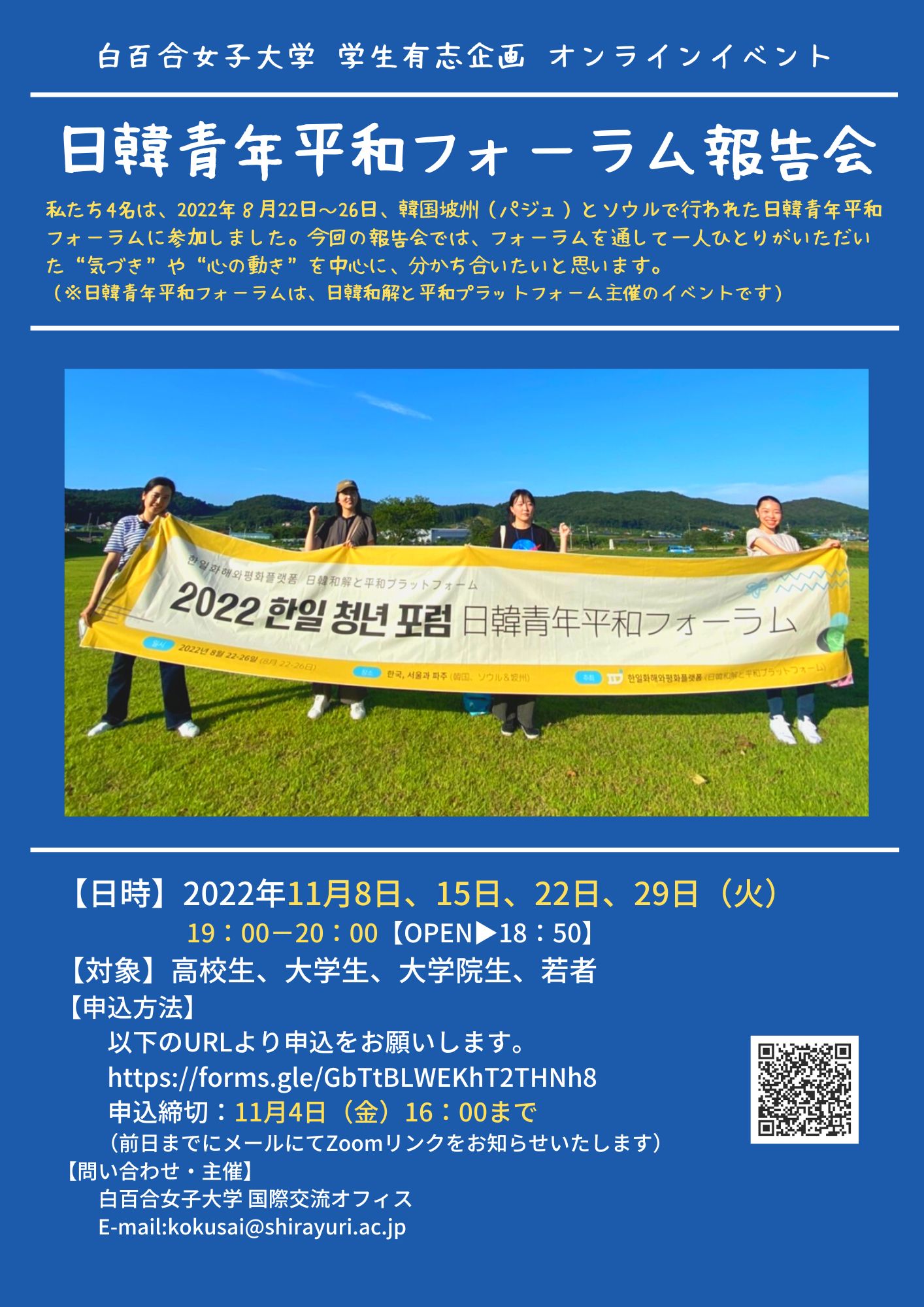 このたび4名の学生が、日韓和解と平和プラットフォーム(※)主催「日韓青年平和フォーラム」に参加しました。