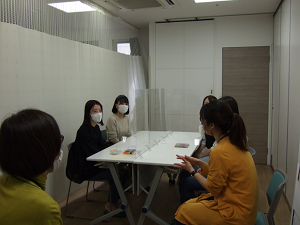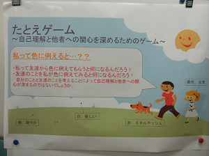 グループワークでは、職員の方の進行で、お子さんたちと一緒に学生の立案した「たとえゲーム」を実際に行ってみました。「自分を色に例えると何色か」を自分で考え、他のメンバーからも「○○くんといえば水色」などと考えてもらうゲームで、お子さんたちは、自分で考えた色と同じ色を他の人が言ってくれるとうれしそうな表情をみせてくれました。職員の方々からも、「いつも見せない様子が見られてよかった」といった感想をいただきました。