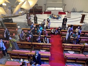 最後にチャペルへ移動して、歌唱活動の機能と役割や子育て支援について研究を行っている春日先生が保護者へ向けて、絵本の読み聞かせや音楽への触れ合いが子どもに与える影響についてお話をしてくださり、実際にクリスマスの絵本の読み聞かせがありました。初めてのチャペルに緊張気味な子どもや、絵本の近くまで行って聞き入る子どもなど、プレイルームでは見られなかった面を見ることができました。チャペルで集合写真を撮った後に解散となりましたが、学生スタッフに落ち葉をプレゼントしてくれたり、まだ遊びたいと言ってくれる子どももいて、短い時間ではありましたが心温まる日となりました。