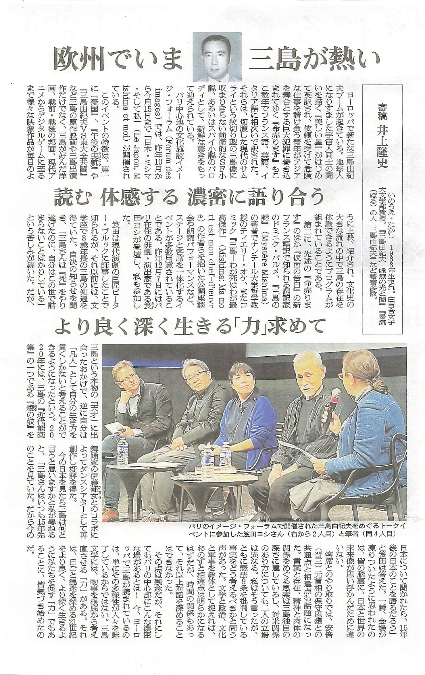 この寄稿では、パリ中心地の文化施設イメージ・フォーラムで昨年10月から今年1月15日まで開催されているイベント「日本・ミシマ・そして私」に触れながら、現下の欧州における三島由紀夫人気とその背景について語っています。