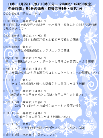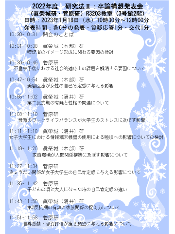 1月18日(水)と25日(水)の2回に分けて、「心理学研究法Ⅱ」(担当:菅原・眞榮城)を履修している3年生たちが卒論構想発表会を実施しました。