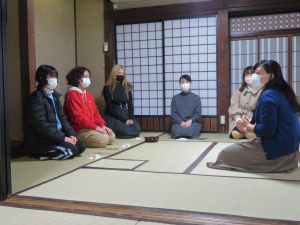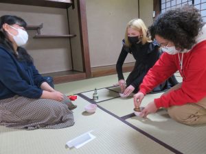 発表後は日本文化体験の一環として茶道に挑戦。普段、茶道や華道のクラブが活動している国の登録有形文化財であるめぐみ荘(旧菊池家住宅主屋)を使用して行いました。初めは少し緊張した表情の留学生たちでしたが、日本語教育副専攻を修了した院生の優しい指導のもと、落ち着いた和やかな雰囲気の中で楽しく取り組みました。