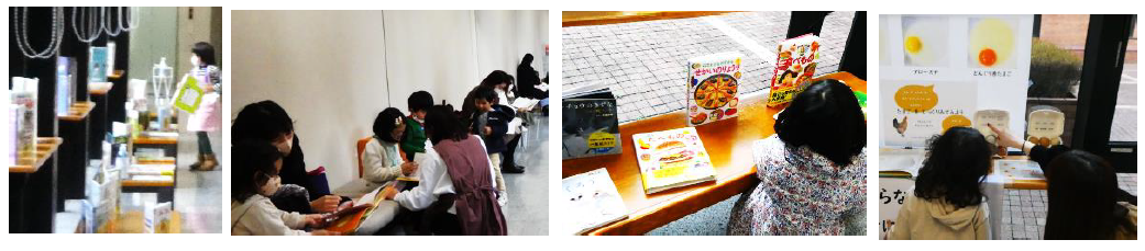 教室外の廊下には,活動とつながりのある絵本コーナーや卵の展示コーナーを設定しました。展示された本との出会いを楽しんだり,多様な卵を観察したりしながら,自分の学びを広げたり深めたりする参加者の皆様の姿がありました。