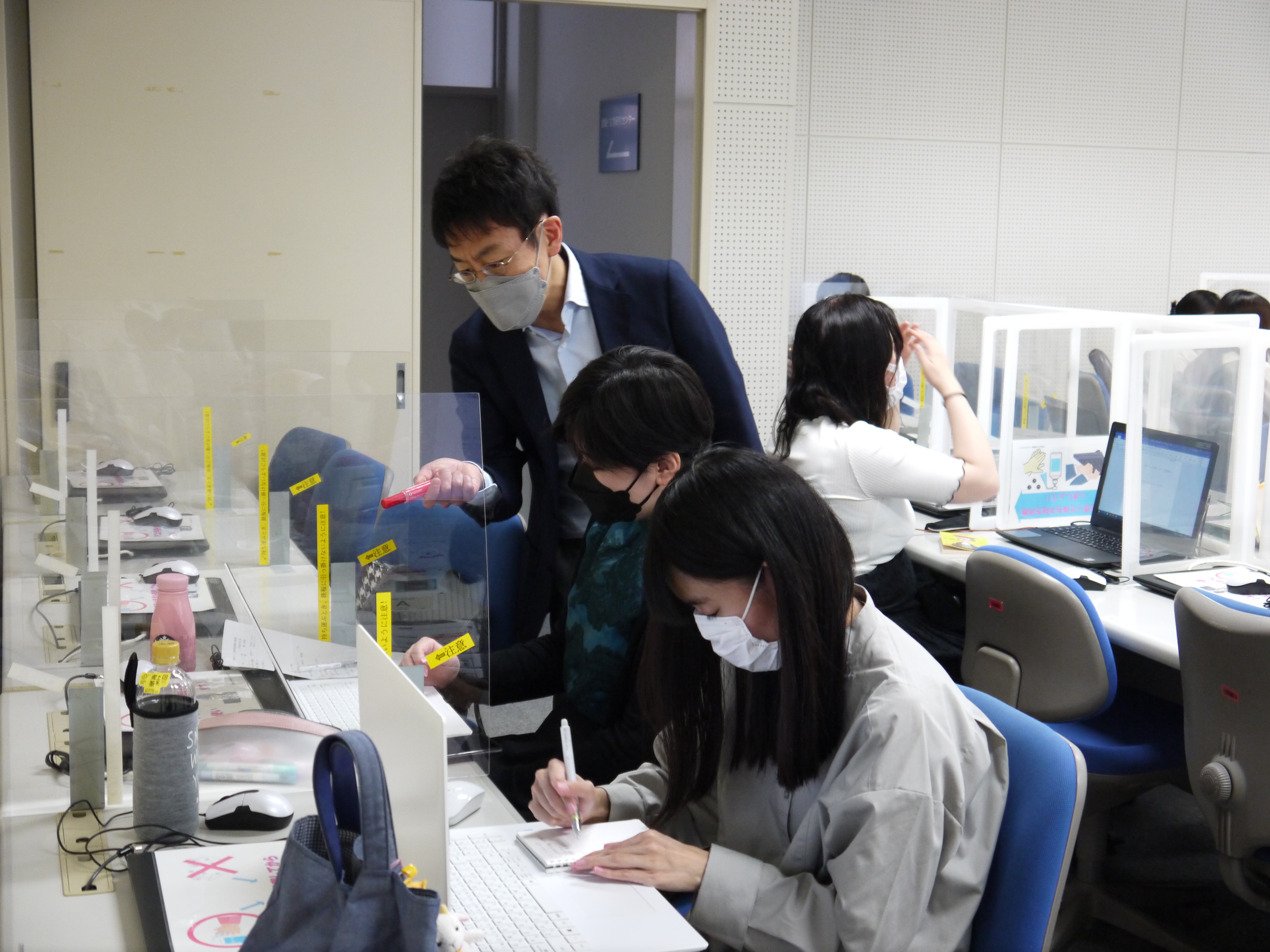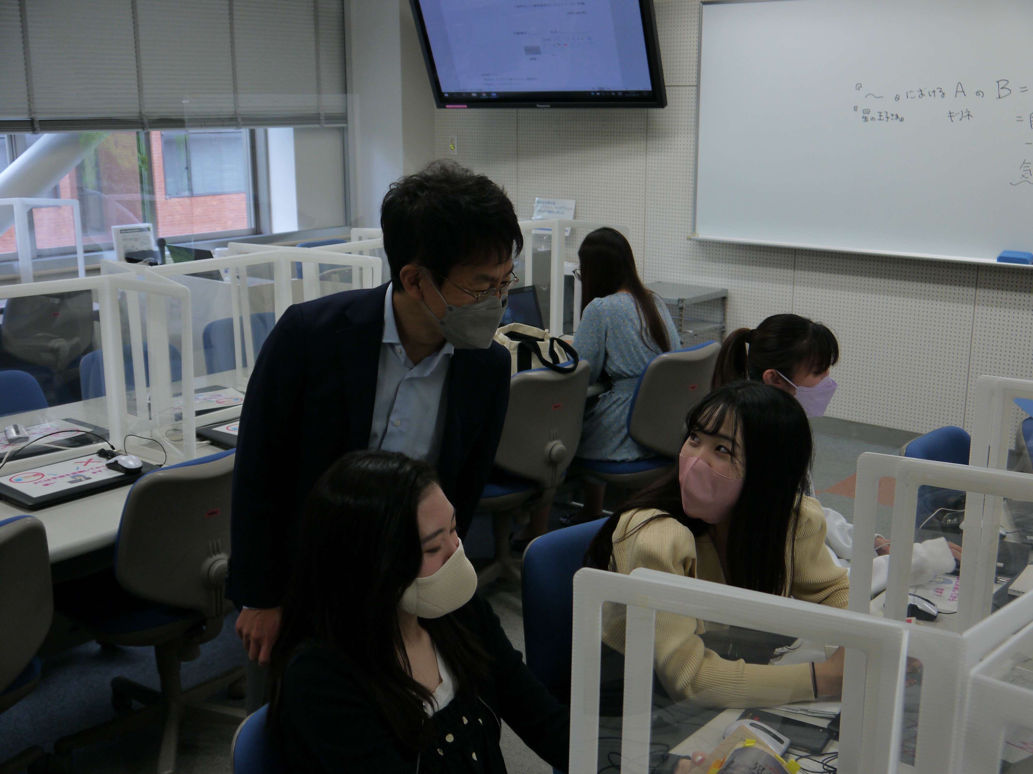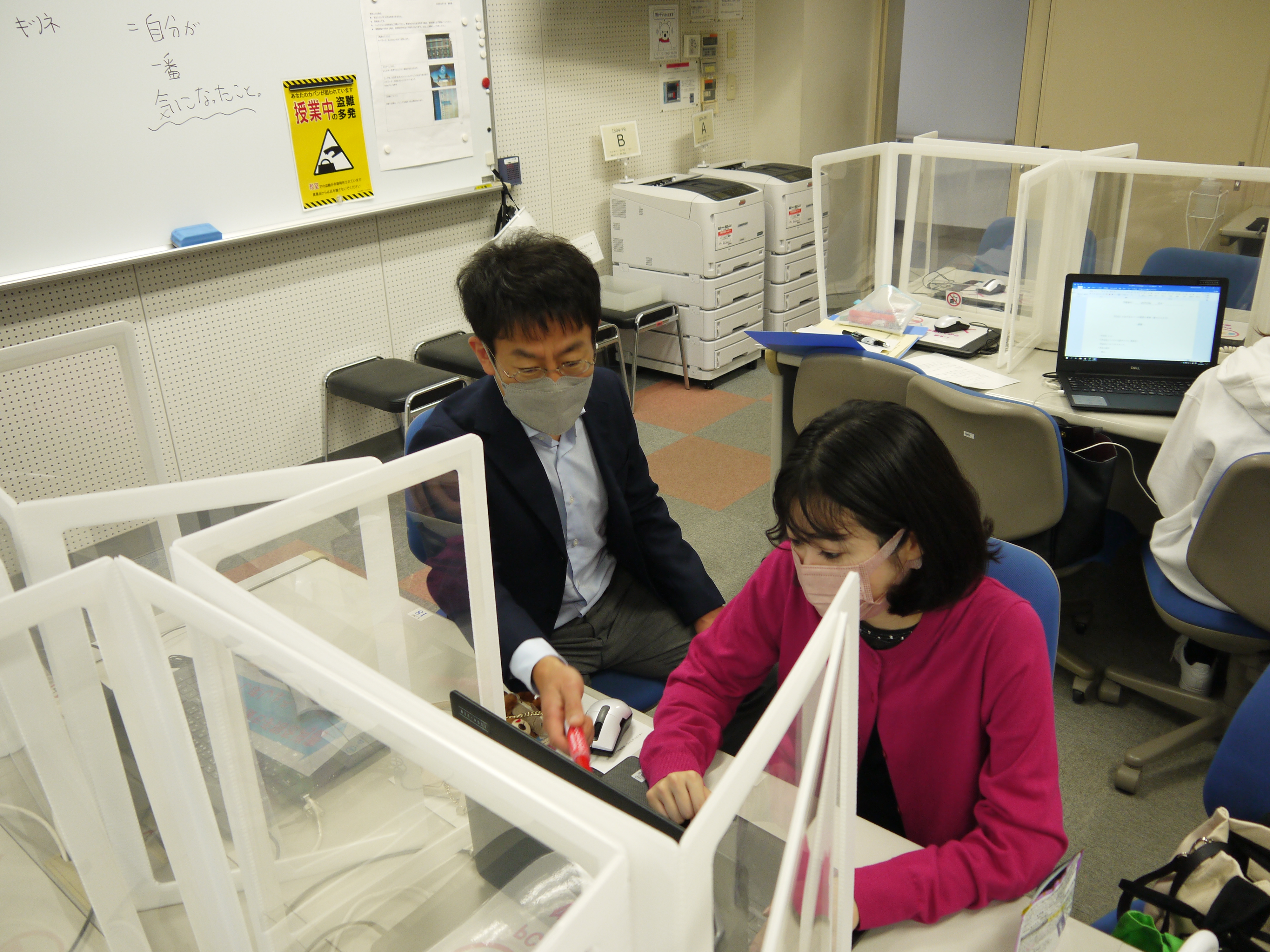 ※ プレゼンテーションで配布する資料を各自作成、先生から直接指導を受ける授業風景を撮影