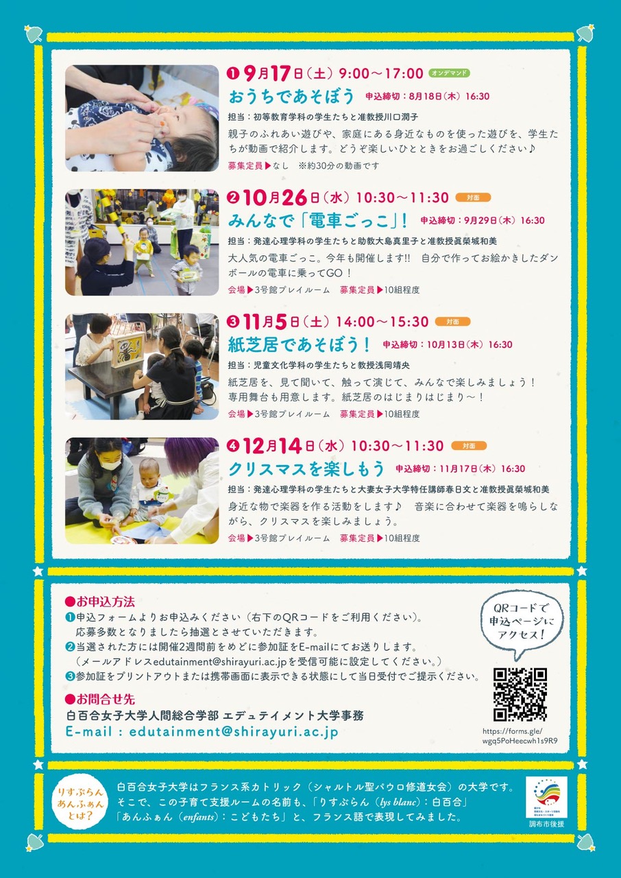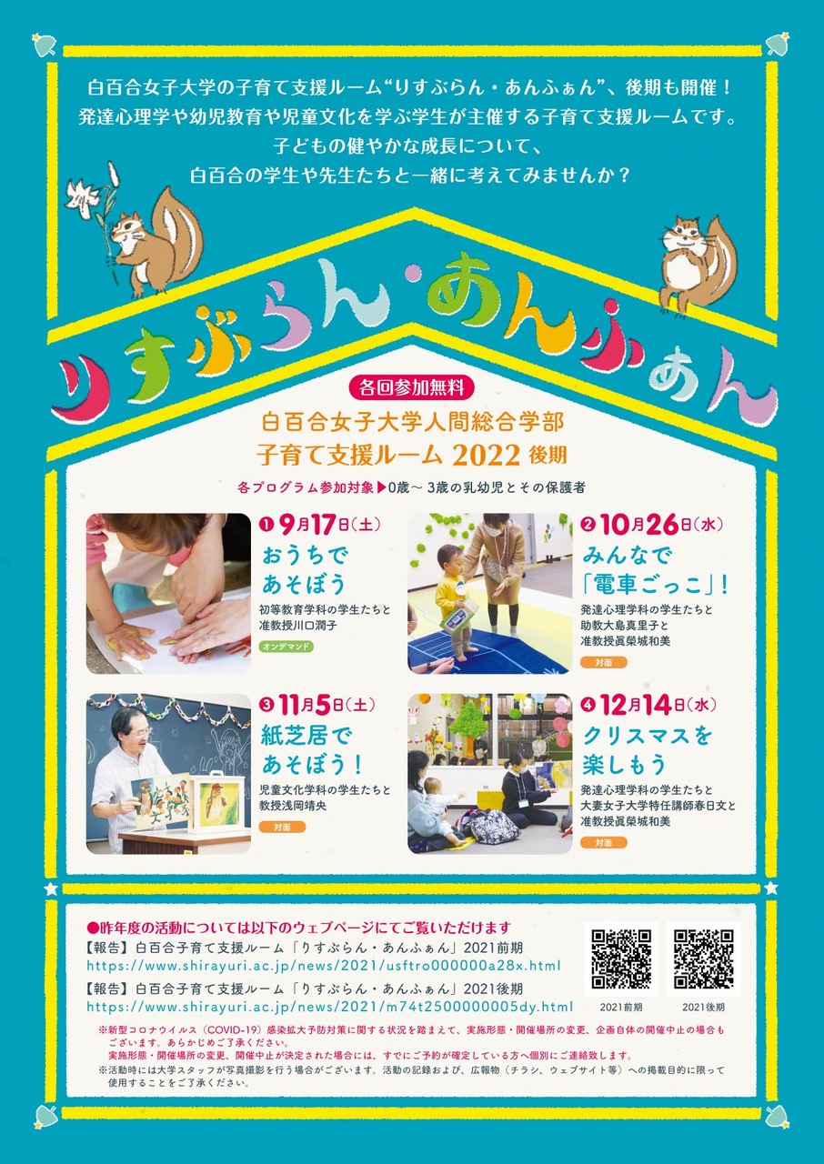 人間総合学部主催 白百合子育て支援ルーム「りすぶらん・あんふぁん」2022年度後期を開室します