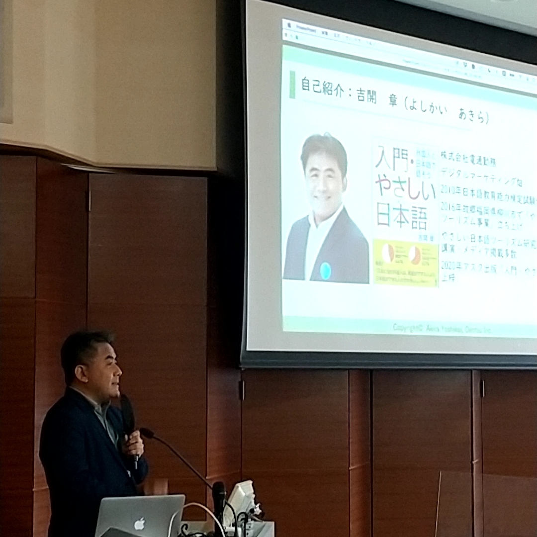 昨年度に続き、今年度も国語国文学科の「異文化とコミュニケーション」(武田加奈子准教授)の授業において、講師の吉開章さん(電通ダイバーシティ・ラボ「やさしい日本語」プロデューサー)をお招きし、「やさしい せかい やさしい日本語とやさしい気持ちがひらく未来」というテーマのもと、講演会を開催しました。今回の講演会には、日本語教育副専攻を履修し今年度教育実習を行う予定の学生も、日本語教育で「やさしい日本語」が必要とされている場面をより体感するために一緒に参加しました。