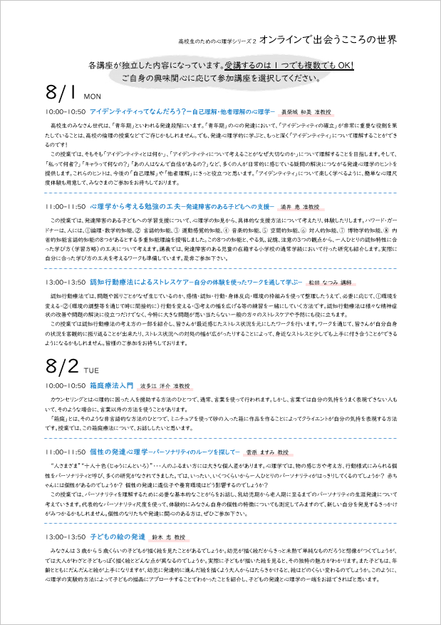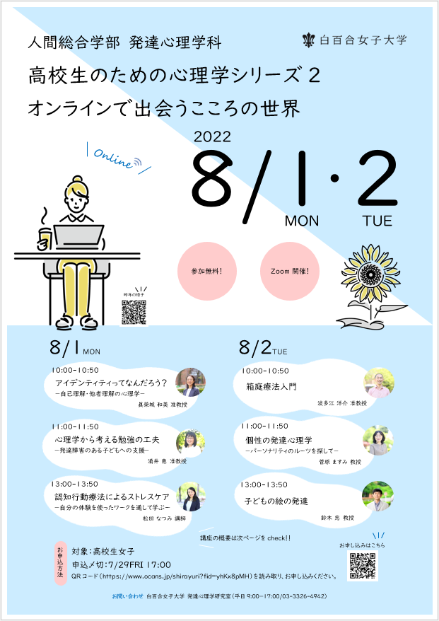 そこで、白百合女子大学発達心理学科では、大学の教員による高校生向けの講座を昨年より始めました。今年は2回目で、6つの講座を行います。