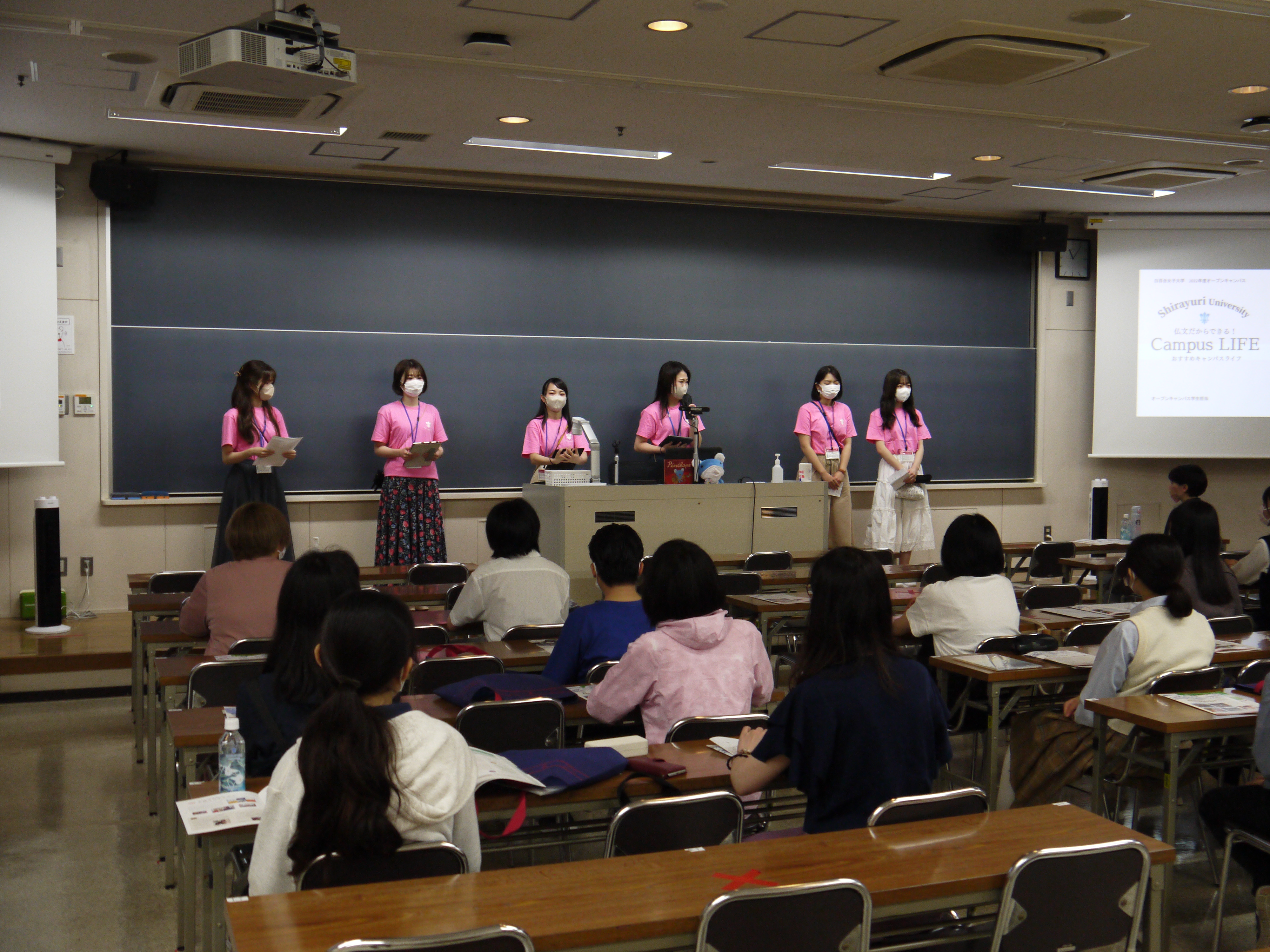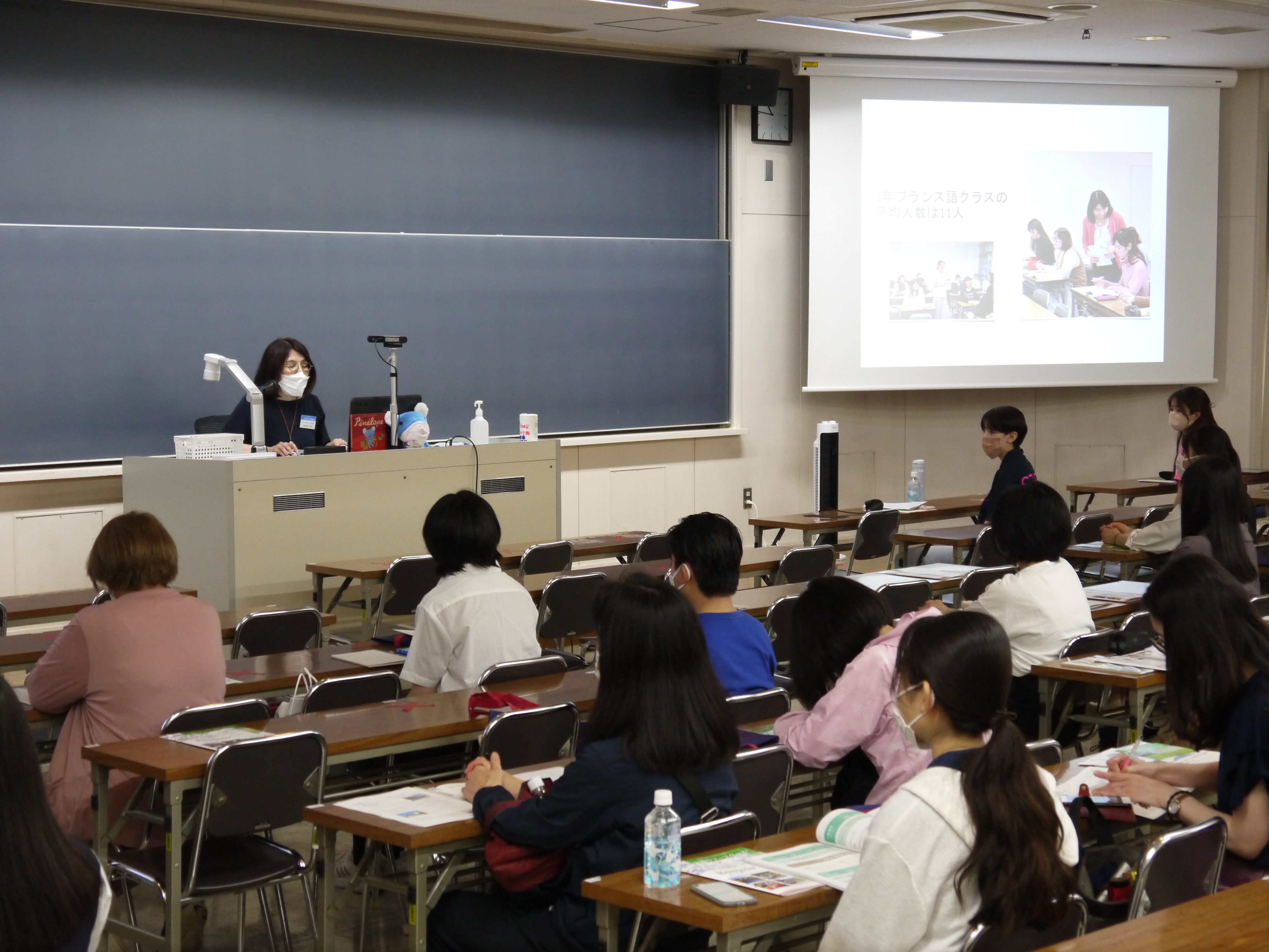 6月18日(土)、今年度最初のオープンキャンパスが開催されました。今回は、教員による学科紹介と模擬授業だけでなく、初の試みとして在学生によるプレゼンテーションが行われました。白百合仏文の魅力を高校生の皆さま、保護者の皆さまによりよくお伝えするためにはどうしたらよいかと、教員、学生ともに知恵を出し合い、入念なリハーサルを重ねて迎えた当日は、お天気にも恵まれ、活気溢れる一日となりました。新型コロナウイルス感染症対策として、例年より大きな教室で皆さまをお迎えすることになり、いつものようなアットホームな感じが出ないのではないかという危惧もありましたが、多くの方々にご来場いただき、当初の心配はまったくの杞憂に終わりました。