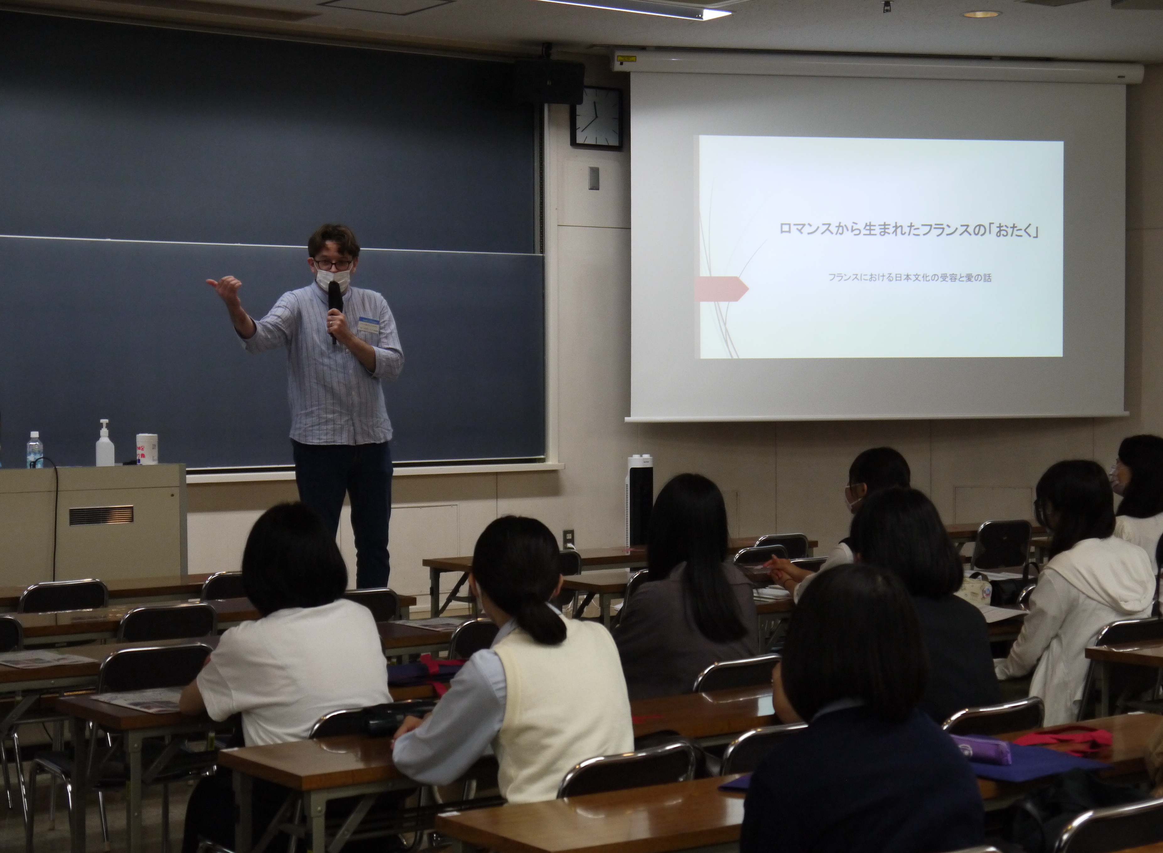今回の模擬授業は、トリスタン・ブルネ先生による「ロマンスから生まれたフランスのおたく」という、なんとも興味深いタイトルの講義でした。日仏合作による初期のアニメなどの貴重な映像も見ながら、そしてブルネ先生のユーモアに包まれながらの40分間はあっという間で、いかにしてひとつのロマンスからフランスのおたくが生まれることになったのか、その過程がわかる大変面白い授業でした。日仏のジェスチャーの違いがわかる映画の場面もあり、異文化コミュニケーションに関心のある方にとっても示唆に富む内容だったのではないでしょうか。