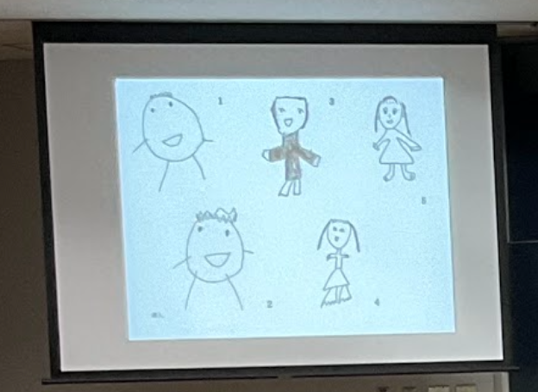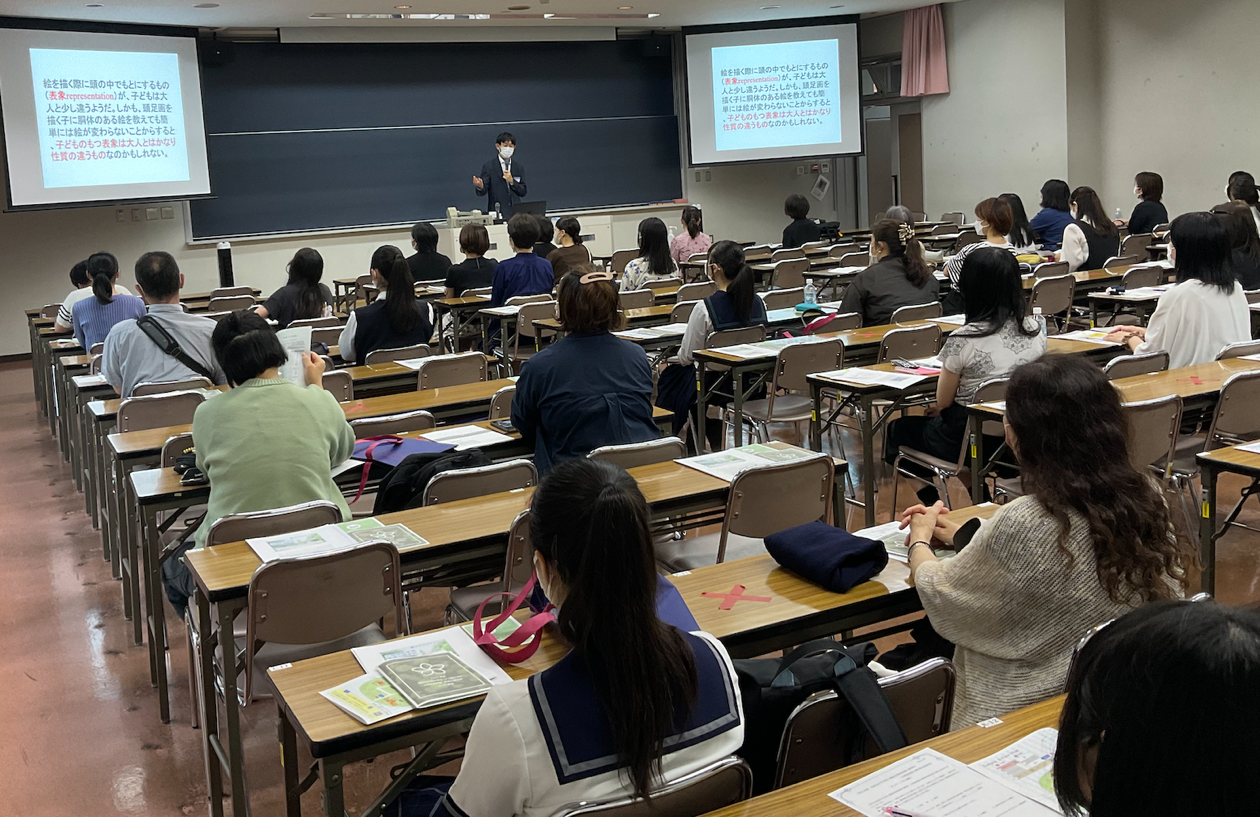 模擬授業は、鈴木忠先生による「子どもの絵-発達心理学からのアプローチ-」でした。3歳前後の子どもが描く頭足画を題材にした研究から、子どもは絵がただ下手なのではなく、子どものもつ表象(イメージ)が大人と性質が違うものであるというお話を伺いました。高校の授業とは一味違う発達心理学科ならではの視点で行われた模擬授業に、皆さん真剣に聞き入っていました。