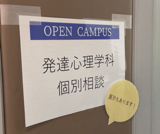 教室や廊下では、教員紹介や授業内容の展示、ビデオ上映もありました。発達心理学科の雰囲気を知ってもらうことができたのではないでしょうか。