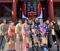 本年度の前期より、静宜大学(台湾)から3名、パリ大学(フランス)から1名の交換留学生をお迎えしています。このたび、国際交流活動団体Cosmopolite(コスモポリット)主催の留学生との交流企画「留学生と日本文化体験(着付け・飴細工)」が、4月5日に行われました。当日は、8名の留学生と日本人学生が集まり、浅草で着物を着て仲見世を散策し飴細工に挑戦しました。飴細工は90℃程まで熱してやわらかくした飴を、素手と握りバサミ一本を使って美しく造形する日本の伝統文化です。飴の温めると柔らかく、冷めると固まる性質を使って作る飴細工は、棒の先につけた丸い飴を、ハサミで切ったり伸ばしたらしながら飴を無駄にすることなく作り上げます。日本人の参加学生にとっても初めての体験となりました。お昼にはもんじゃ焼きとお好み焼きを堪能し、浅草寺をお参りした後仲見世を練り歩きスイーツを味わいながら交流を深めました。