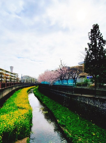 大学近くの仙川を彩る菜の花と桜のコラボ、菜の花色の冊子の表紙も、ご覧ください。