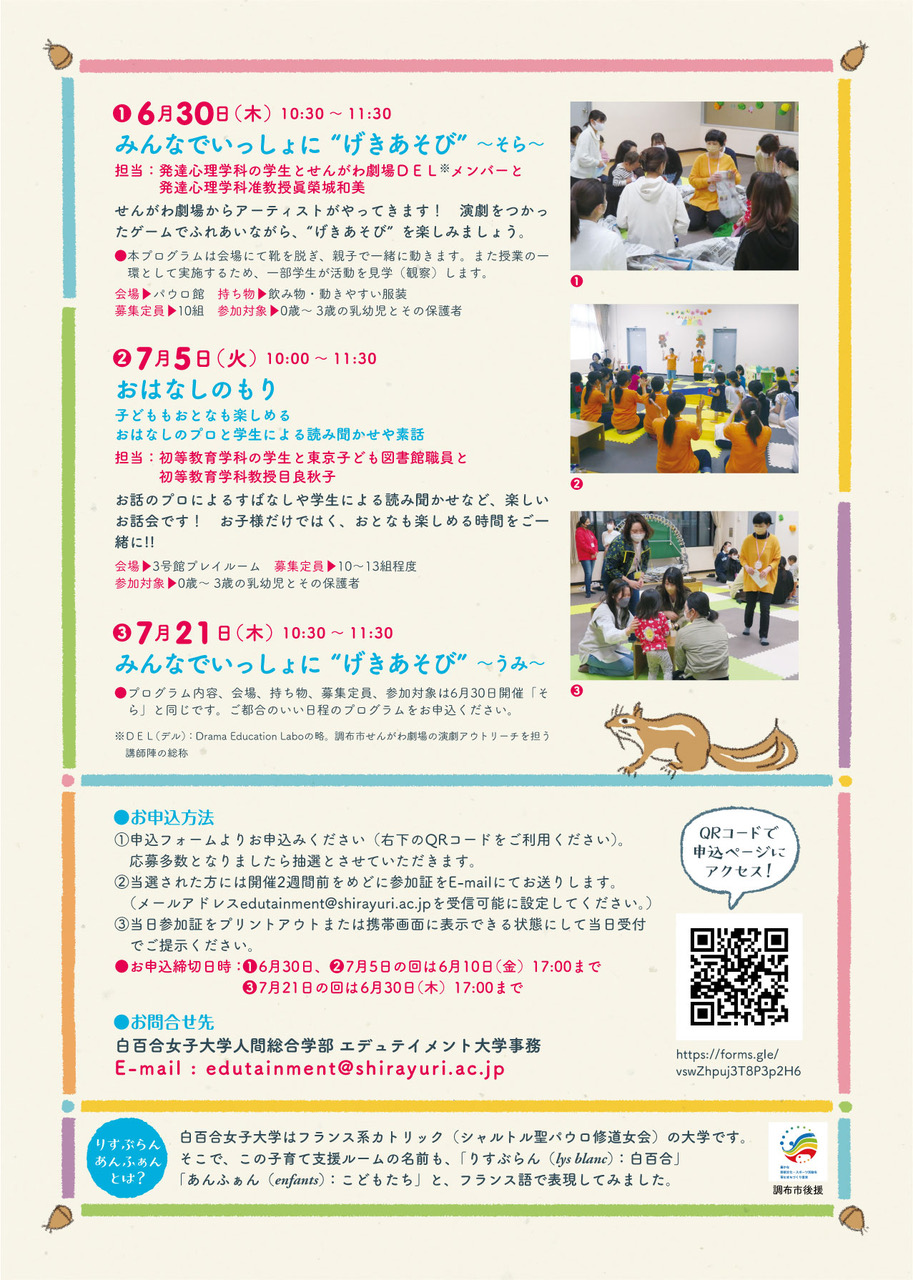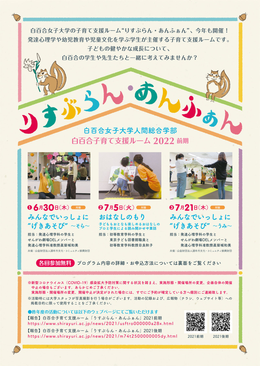 「りすぶらん・あんふぁん」は、本学で児童文化や発達心理学や幼児教育を学ぶ学生が主催する子育て支援ルームです。ほっと一息つきながら、子どもの健やかな成長について白百合の学生や先生たちと一緒に考えてみませんか?