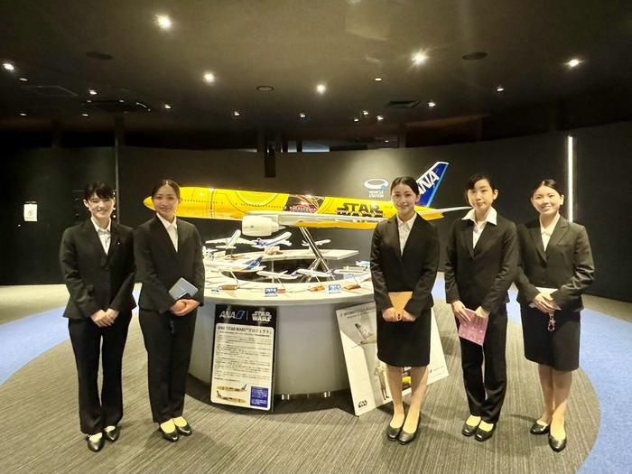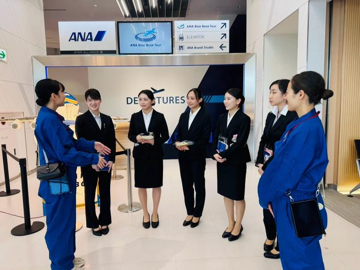 ツアーの最後にはCA 2名の方に、直接質問し交流する機会が設けられ、「学生時代にやっておくべきこと」「仕事をするうえで大切にされていること」「ANAを選んだ理由」など、在学生や高校生からの質問に、一つ一つ丁寧に笑顔で答えてくださり、貴重な時間を過ごしました。その優しく誠実な二人のお人柄に接する中で、単なる訓練施設についての学びだけには留まらない、「ANA Blue Base」に込められているANAの思いに触れることができたことも得がたい機会となったようです。