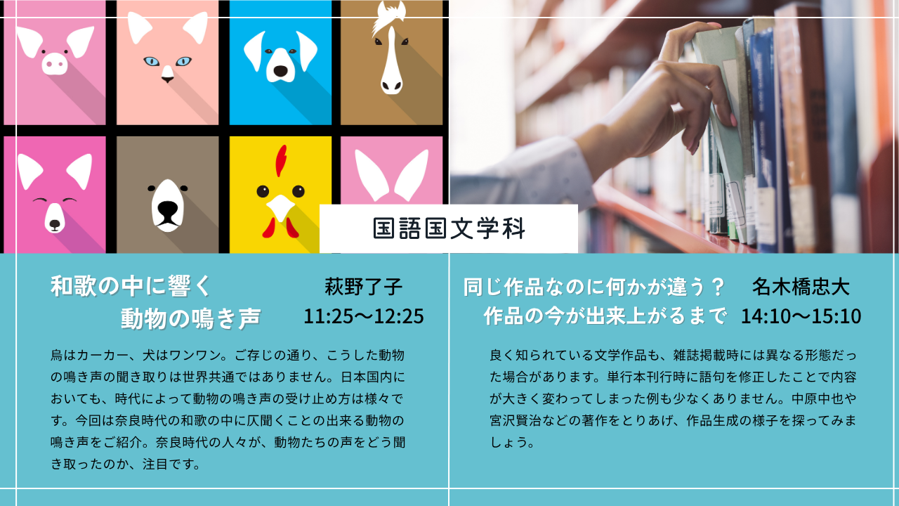 【企 画】模擬授業(学科別ガイダンス)、キャリアデザインプログラム紹介、学食体験、大学紹介、クラブ活動紹介、キャンパスツアー、教員・学生トークコーナー、入試相談コーナーなど