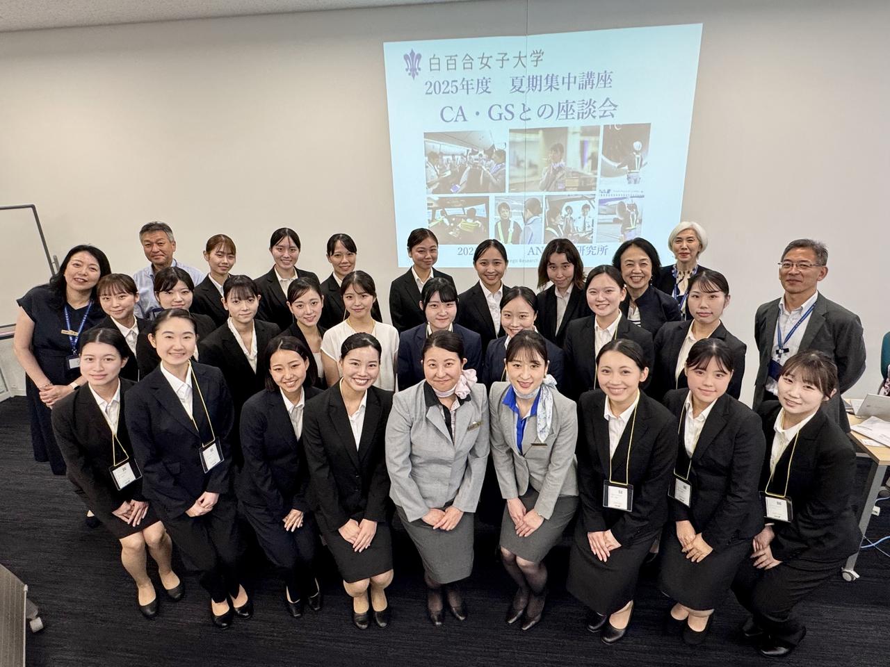 4日目は、羽田空港近隣の訓練施設であるANA Blue Baseを見学した後、本学卒業生であるCAとGSとの座談会が行われました。4日間の締め括りとして、プログラム科目「ホスピタリティの英語Ⅱ」担当教員でもある恒川久美主席研究員からのまとめの講義のあと、村松絵里子主席研究員、平野英子主席研究員、中村敏章主席研究員、そして、堀口秀樹執行役員産学連携部長よりそれぞれ履修学生へのメッセージをいただきました。