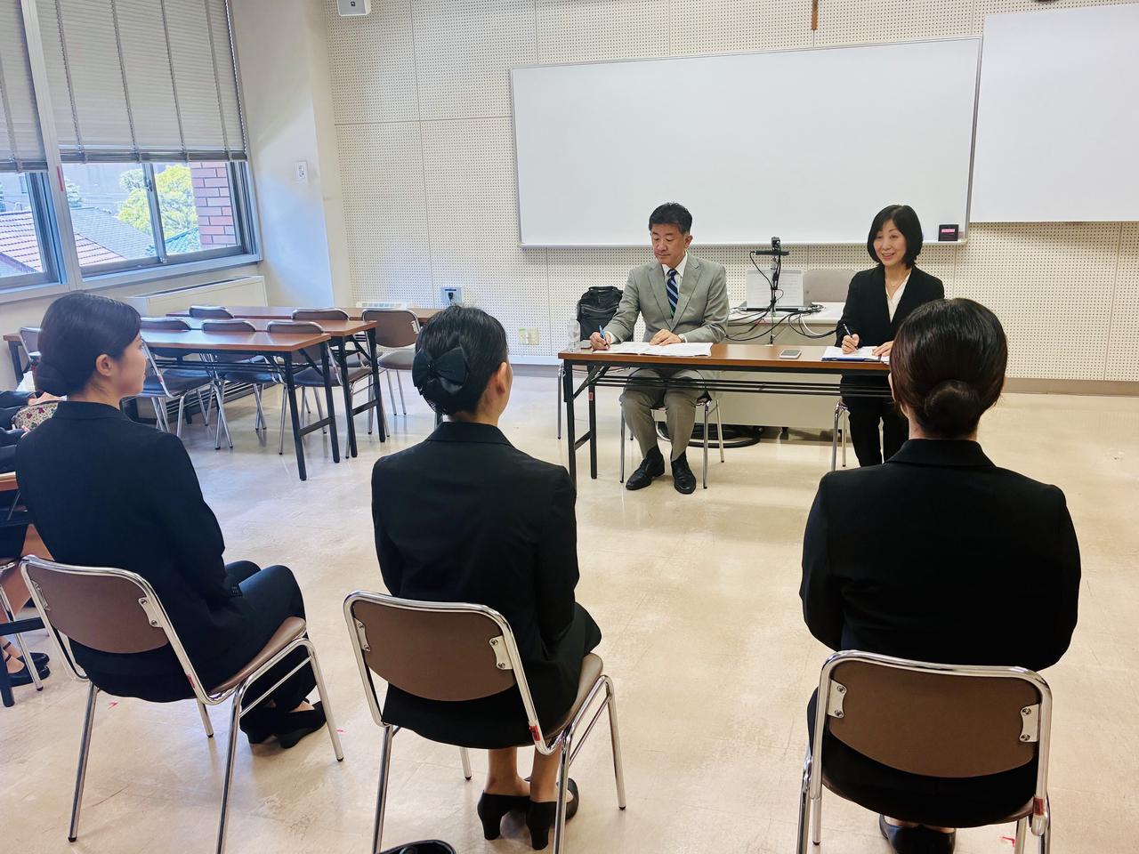 1・2日目は、学内において、航空業界の概要、ホスピタリティの概念などについて学んだ後、模擬面接を体験しました。開講前は緊張からか表情が硬かった学生たちも、2日目終了時には皆に充実感から出る自然な笑顔が戻り、学内での講座を終えました。