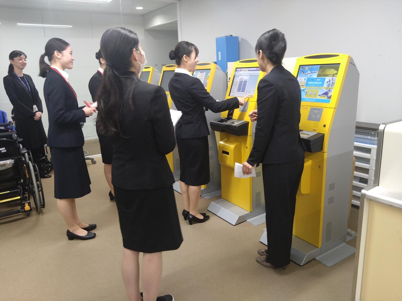 教官お二方から地上旅客職の業務について、ご指導いただきました。限られた時間の中で確認業務があり、瞬時に把握した旅客情報を客室乗務員へ伝えるなど、安全運航に不可欠な存在であることがわかりました。