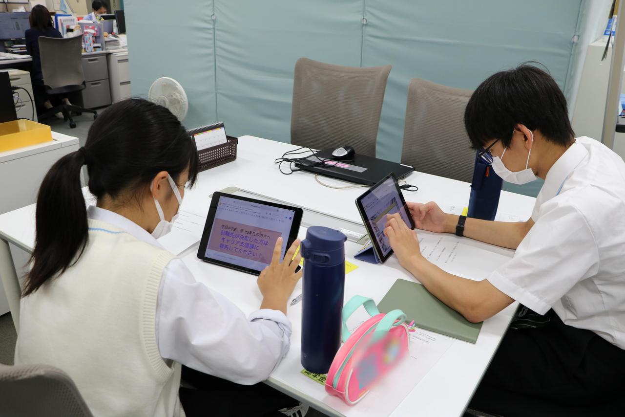 その後、各部署に行き様々な仕事を経験していただきました。「責任ある仕事を一人ひとりが丁寧に行っていて、大学はたくさんの人に支えられていることが分かった。」「相手の気持ちを考えて掲示を考えたり、伝えたいことやテーマを元にポスターを作成するのは初めてだったので大変貴重な経験になりました。楽しかったです。」という感想をいただきました。しっかりと話を聞き、意欲的に仕事に取り組む姿がとても印象的でした。