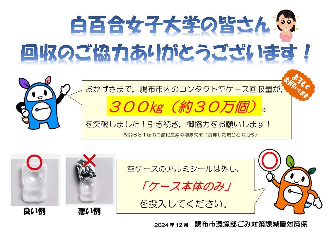 調布市が行っているプラスチックごみの減量・リサイクル活動の取組のひとつ「アイシティ ecoプロジェクト」に協力しています(ご参考/調布市ホームページ)。学生や教職員に向けて使い捨てコンタクトレンズ空ケースの回収を呼びかけています。